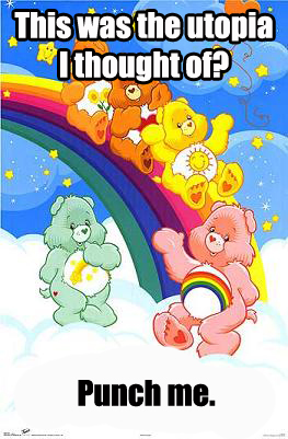 Seriously though. You’d think an all-powerful, all-knowing being like God would just announce himself to the world, clear things up, and then have everyone live in a Care Bear utopia playing tag on rainbows and sleeping in fluffy cloud beds.