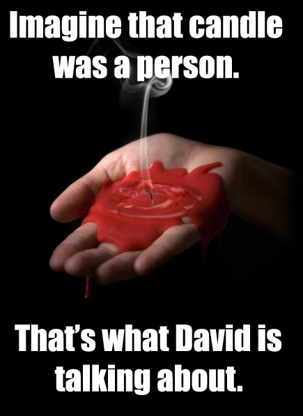 What is the deal with this guy? To quote one of the great philosophers of our time, a brilliant and insightful woman known as Fergie, “Where is the love?” Seriously David…where is it? You seem to want God to shower you with love, yet shower others with…well with torture, pain and death.