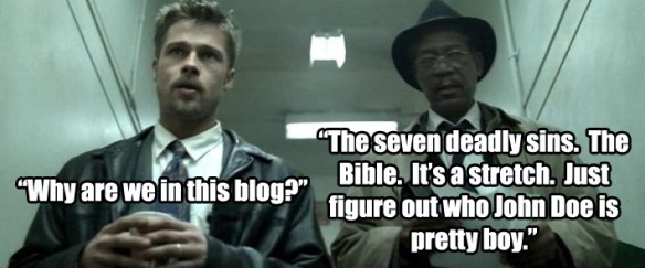 I’m not trying to give the guy an out to be a crazy pyscho or anything. I mean, I think we can all agree that the movie Seven does a great job of showing that weirdo torturers don’t mingle too well with the rest of society. But I am trying to see David as a regular dude, struggling through his emotions and thoughts like I do